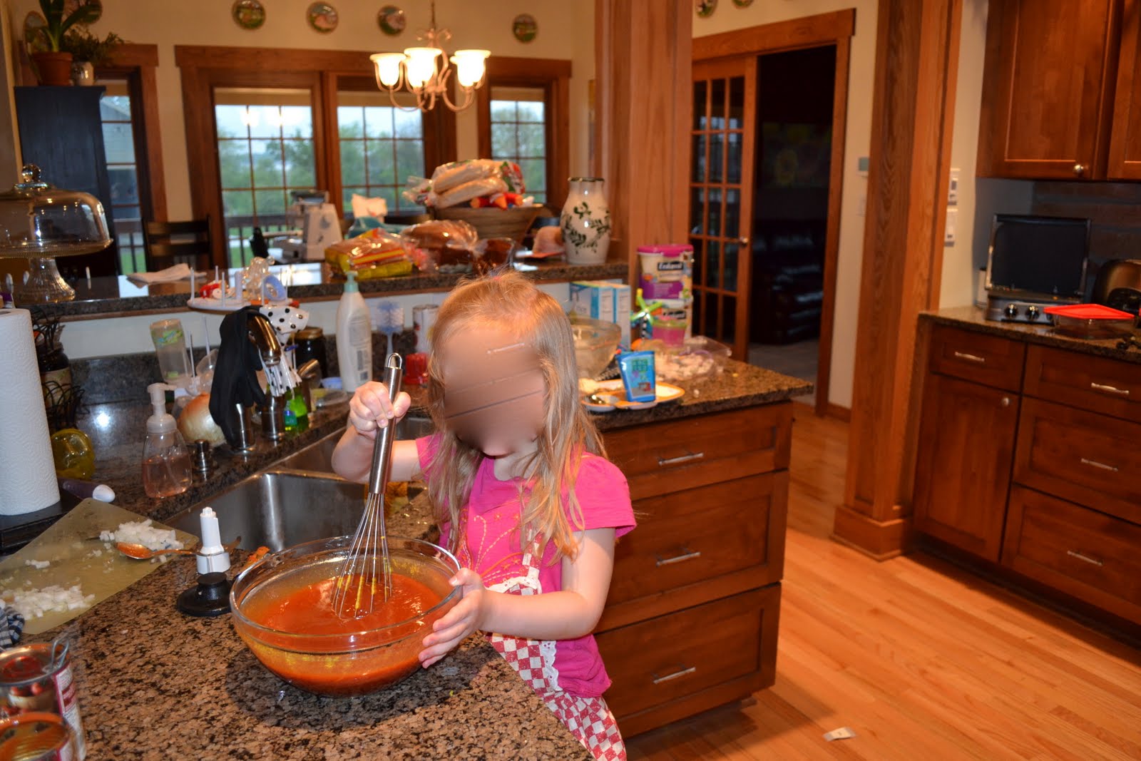 First, you must have the correct apron (this is what real semi-country wives do). Mine, in all it's glory, was a Christmas gift from my loving brothers a few years back...They think they are hilarious. The girls can't read well enough to know what it says...yet. Until that day, I will wear it proudly. I love my brothers. They think I'm awnry (out here they say AWN-ree, in Michigan, we say OR-NA-ree, three syllables. Out here, they are wrong.) but they will both have soft spots in my heart (well until Peep starts talking anyway).